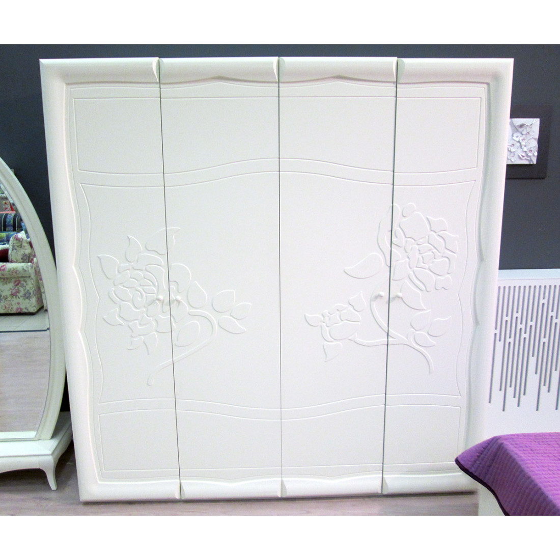 Большой четырехстворчатый шкаф для одежды и белья МН-218-04-220 серии Астория от Мебель-Неман вместителен и функционален. Великолепно исполненная отделка, с оригинальным утолщением фасадов в виде обрамления и лазерной сверхточной резьбой изящного растительного рисунка подчеркивает неповторимость модели. Купить столь объемный гардеробный шкаф в спальню – значит навсегда решить проблему недостатка места для размещения постельных принадлежностей и одежды.