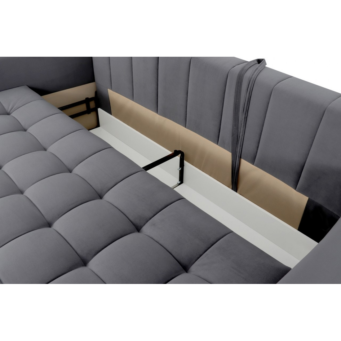 В основании дивана - металлокаркас. Такая конструкция выдерживает большие нагрузки, сохраняя первоначальную форму.