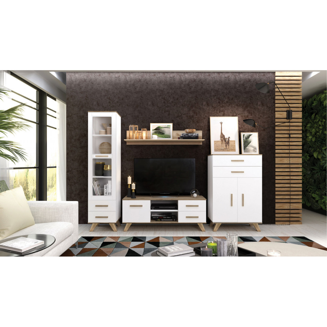 Комплект мебели в скандинавском стиле представлен в исполнении корпус – ЛДСП «Дуб каньон, белый», фасады – МДФ с покрытием глянцевой пленкой ПВХ белого цвета. В наборе витрина с прозрачным стеклом ,навесная полка для размещения посуды, сувениров и других предметов, тумба для телевизора широкая (1350 мм), низкий шкаф для закрытого хранения вещей личные вещи.