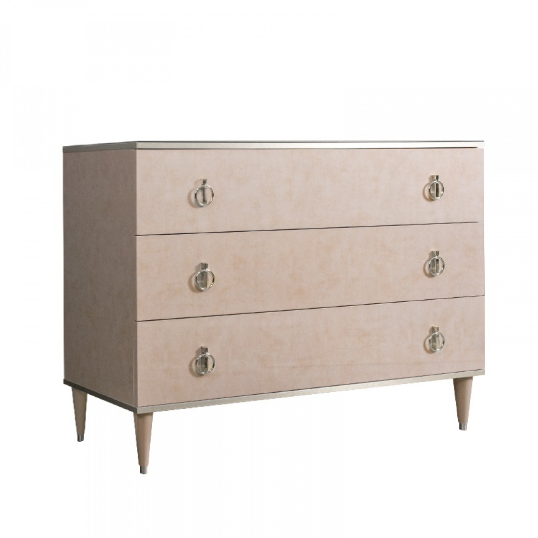Особое внимание стоит обратить на тумбы, комоды и туалетный стол, поскольку они имеют стеклянные крышки. Цвет стекла зависит от выбранного цвета спальни.