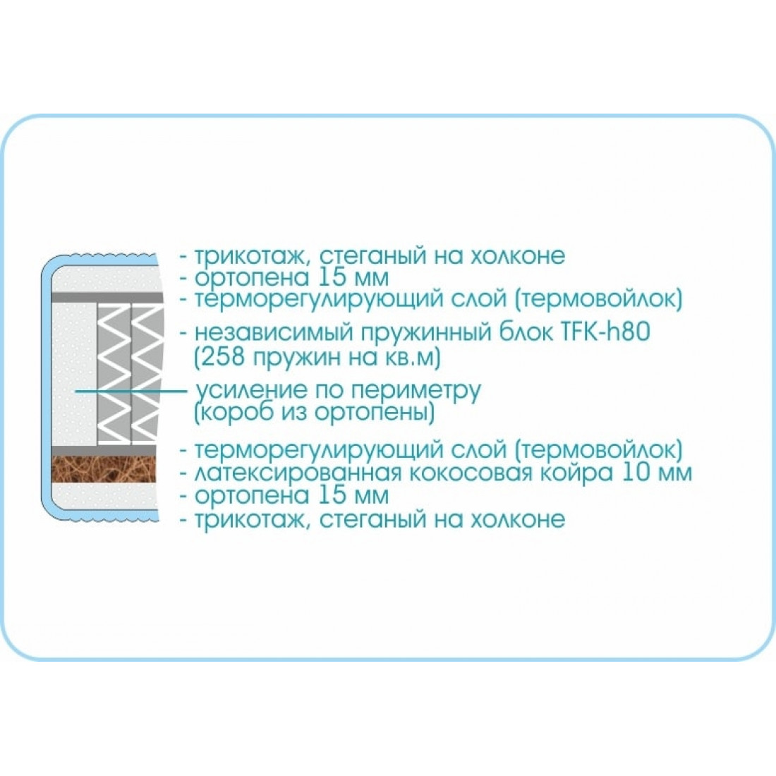 Наполнение: независимый блок TFK, высота блока 140 мм, ортопена 15 мм с двух сторон, кокосовая плита 10 мм с одной стороны, терморегулирующий слой с двух сторон, усиление по периметру - короб из ортопены.