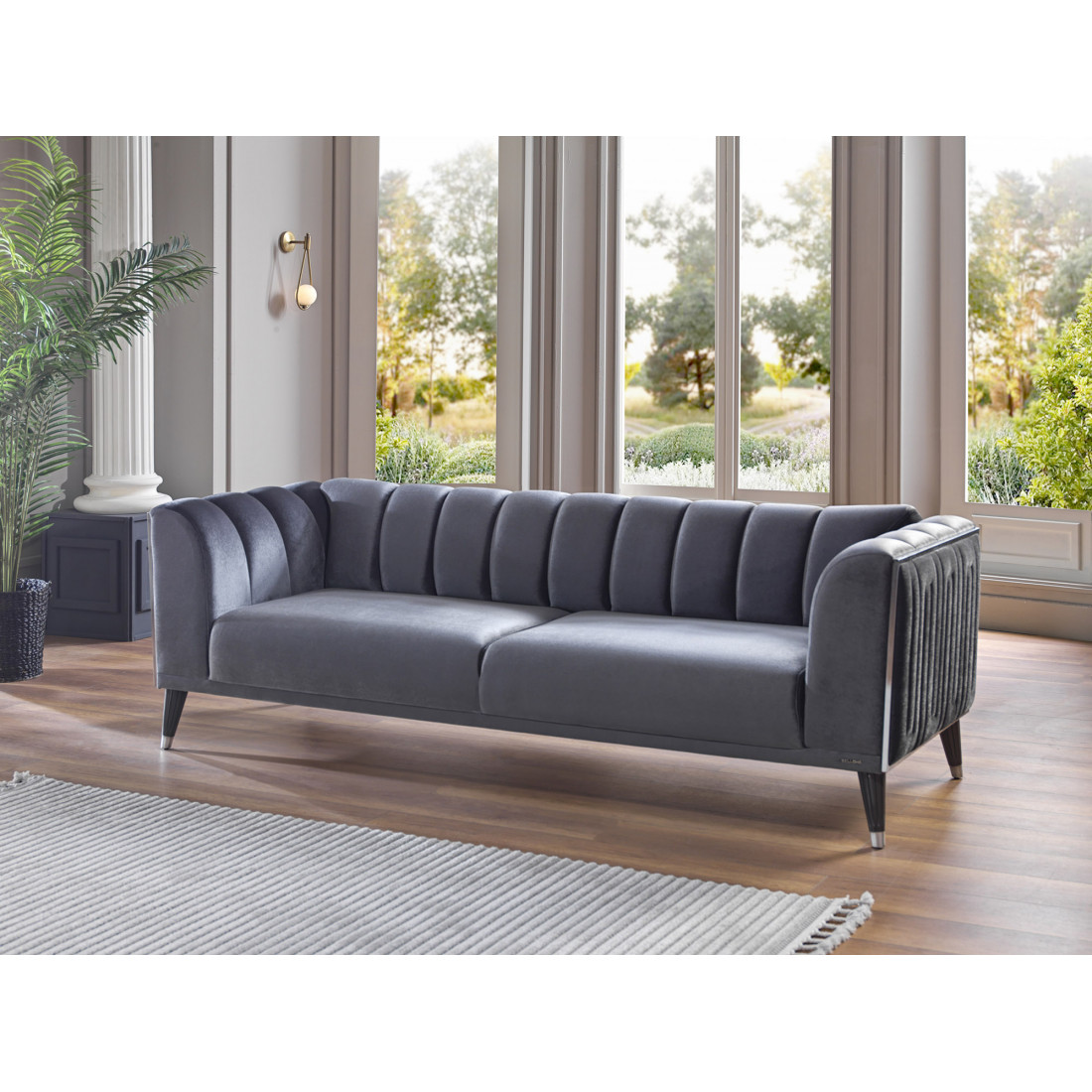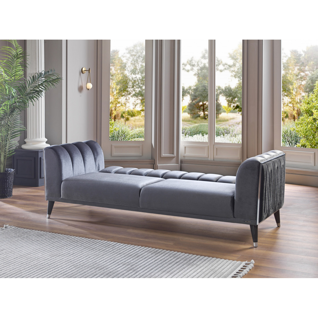 Трехместный диван-кровать Гравита (Gravita) GRAV-02 Беллона вместительный диван с невысокой спинкой. Габаритные размеры дивана 230х88х80см, позволяют трансформировать его в удобную кровать со спальным местом 106*182см. Диван на металлокаркасе, наполнение высококачественный турецкий ППУ. Вертикальная прострочка ткани боковин обрамлена хромированными вставками по периметру. Ножки дивана изготовлены из прочного ABS-пластика.