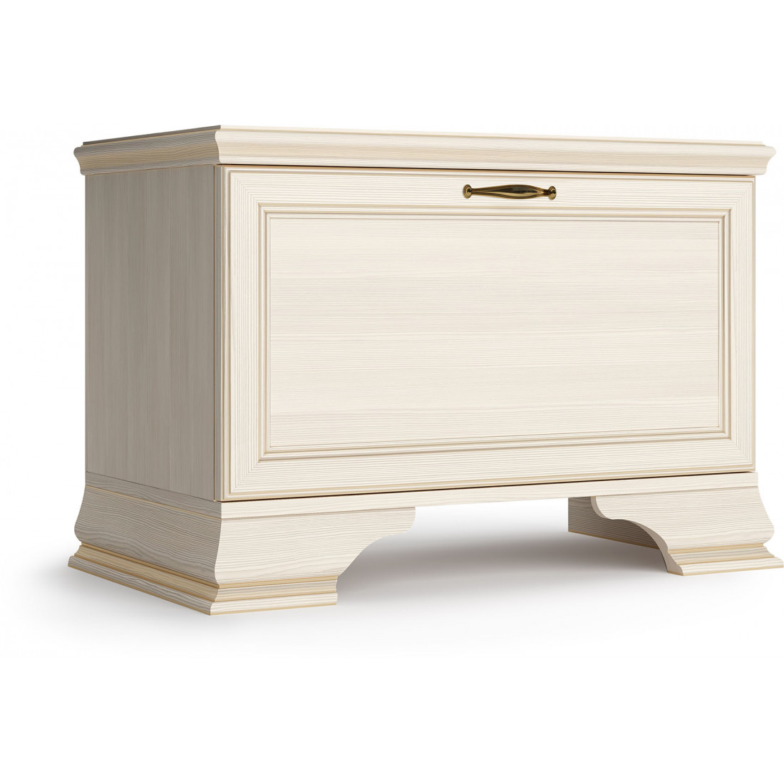 Коллекция производится в текстуре «бодега белый» с эффектом золотого патинирования. Облик «Сиены» дополняют рамочные фасады и карниз в классическом стиле, а также эффектные опоры из МДФ. Мебель комплектуются металлической лицевой фурнитурой премиум-класса в цвете «старая бронза» и надежной крепежной фурнитурой.